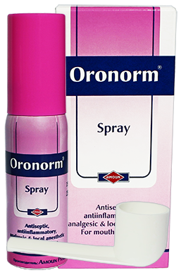 | Oronorm spray 25ml | BENZYDAMINE HCL, CETALKONIUM CHLORIDE, BENZOCAINE |
